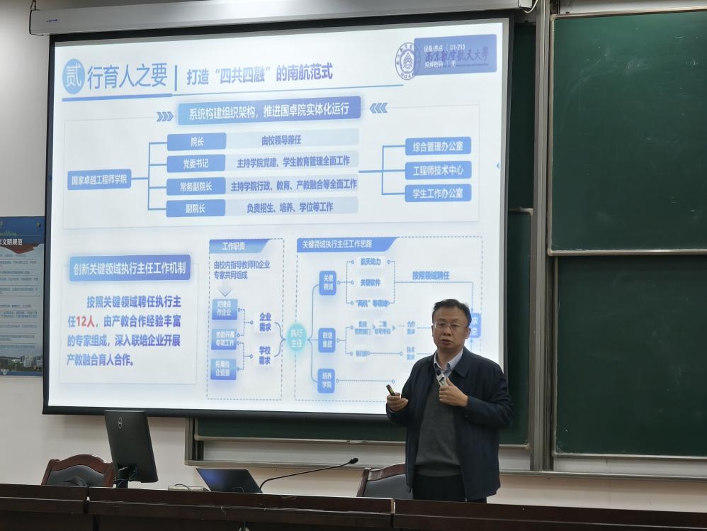 随后,他首先以飞行器制造工程专业负责人的视角,为同学们指明了专业学习的基础方向。同时,作为智能制造系统与技术课题组负责人,他还向同学们展示了课题组在制造物联与大数据技术、制造系统数字孪生技术、AR+具身智能系统、智能工艺规划技术等四个前沿方向的研究进展,生动呈现了智能制造领域的广阔发展前景,激发同学们的科研兴趣与专业热情。